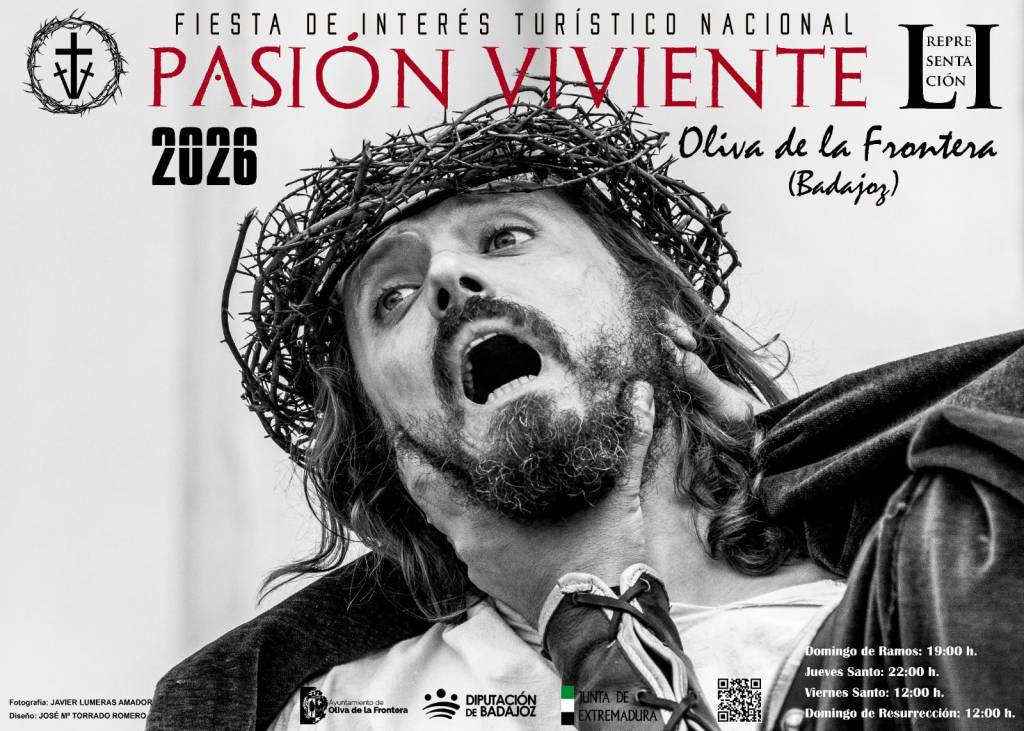 Cartel anunciador de la LI edición de la Pasión Viviente de Oliva de la Frontera patrocinado por Diputación de Badajoz con fotografía de Javier Lumeras y edición de José María Torrado.